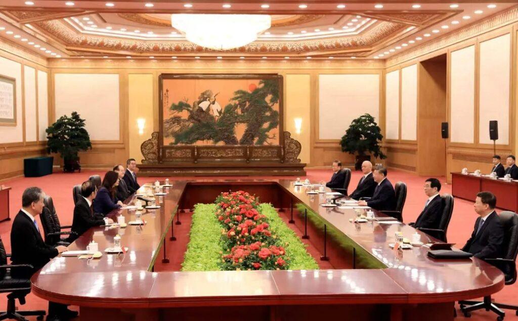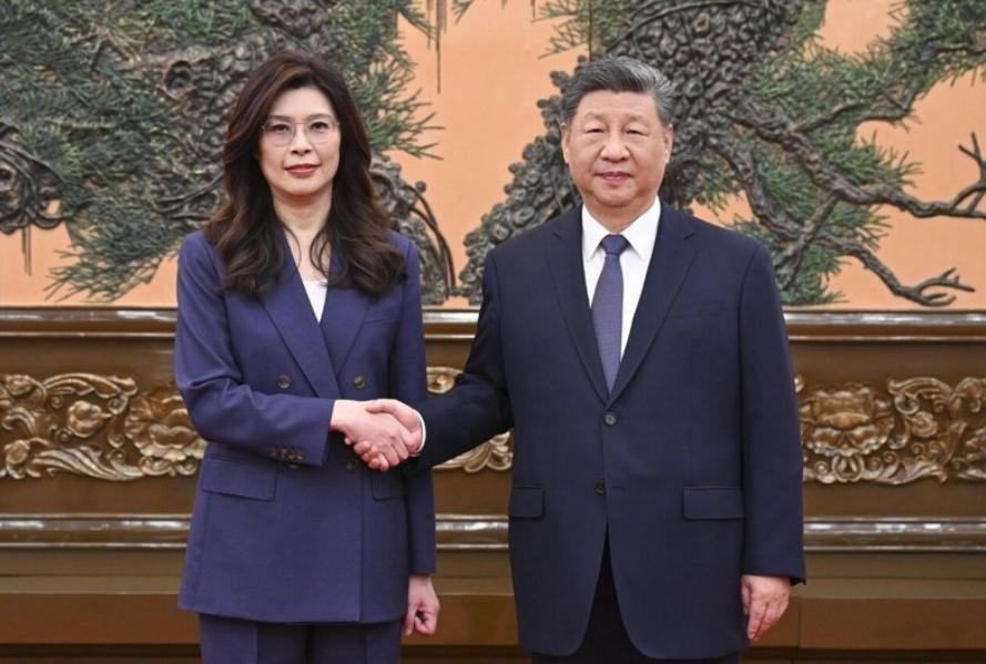 4月10日上午約11點,鄭麗文與習近平在北京人民大會堂見面,習近平步入「東大廳」後稱呼「鄭麗文主席」,習近平表情嚴肅、平淡,鄭麗文露齒而笑,兩人握手約13秒,隨後進入會談場地。
