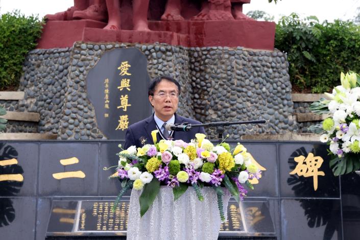市長黃偉哲致詞表示,二二八事件是台灣歷史上極為悲痛的一頁,不僅造成無數家庭破碎,也在社會烙下難以抹滅的傷痕。今天除了向當年及後續白色恐怖時期無辜受難的前輩致上最高敬意,也向長年承受歷史傷痛的家屬表達誠摯慰問。他強調,緬懷歷史不只是追思過去,更是提醒後人珍惜今日得來不易的民主、自由與人權,「歷史事件可以被原諒,但不能被遺忘」,唯有記取教訓,才能避免悲劇重演。