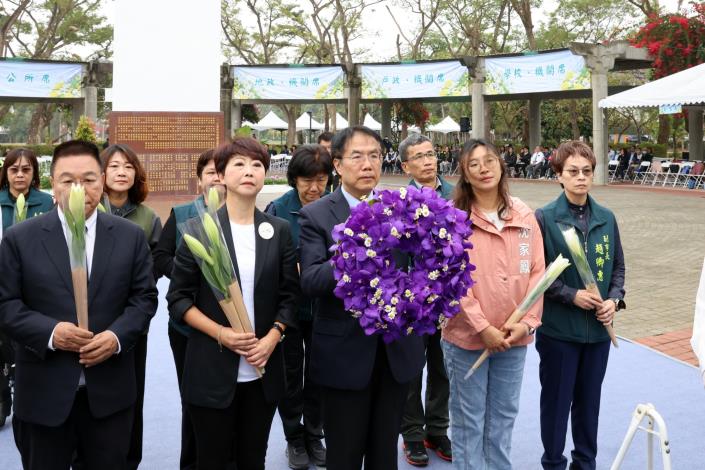 台南市政府今(28)日上午於新營區二二八紀念公園舉辦「二二八事件79週年和平追思會」,由台南市長黃偉哲主持,與二二八事件受難者家屬、各級民意代表、市府各局處首長及各界人士共同出席,透過默禱追思與獻花儀式,表達對歷史的深切緬懷與對受難者的敬意。