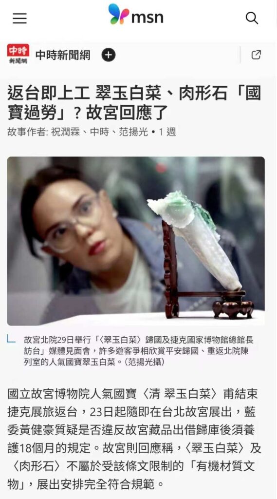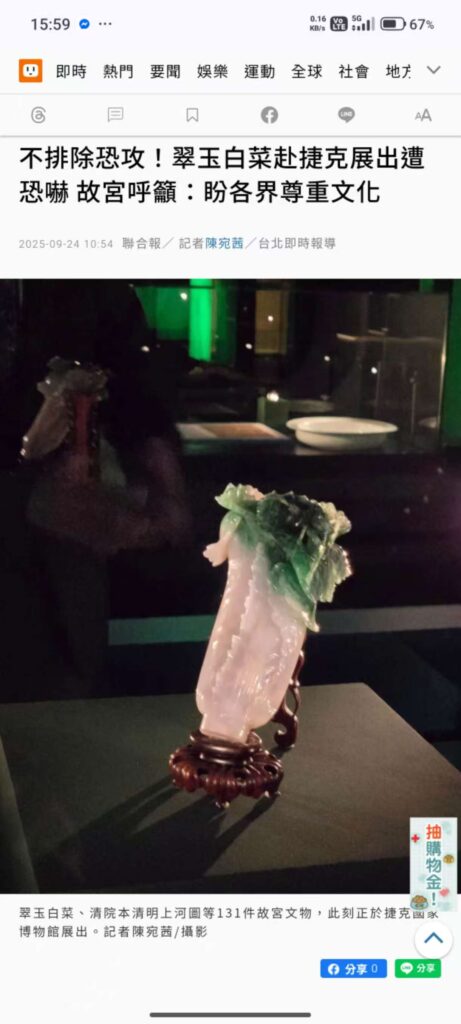 國立故宮博物院國寶「翠玉白菜」日前結束捷克巡展行程並順利返抵台灣。官方指出,此次展覽有助於深化台歐文化交流,並提升台灣文化在國際社會的能見度。然而,隨著文物安全回國,國寶外借他國所衍生的文物保存風險、政治安全考量與文化治理制度,也再度引發學界與社會層面的討論。