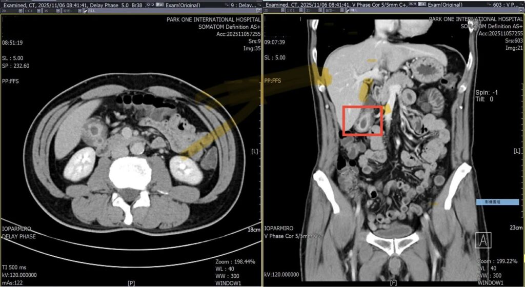 圖2說:博田國際醫院電腦斷層掃描發現,男子的膽囊壁竟異常廣泛性增厚達正常的六倍,確認為臨床上常與膽結石混淆的「膽囊腺肌症」。(博田國際醫院)