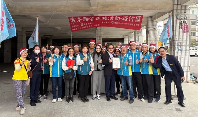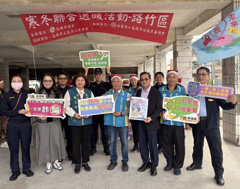 圖:三龍同心慈善會路竹區理事長莊水隆及和平社會福利慈善基金會董事長黃明和等人歲末寒冬之際齊心送溫情。(高雄市警局 湖內分局)