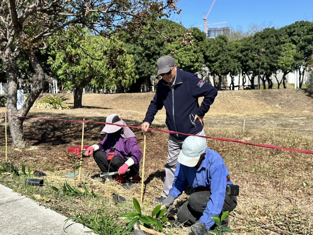 陳局長表示,此次引進的36種原生植栽包含紅柴、蘭嶼肉桂、台灣石楠、魚木、南庄橙及楓港柿等多種兼具生態與景觀價值的植物。種植過程由科博館植物園胡維新博士率領資深志工團隊現場指導,從種植地點選擇、挖穴整地、覆土到澆水養護等步驟逐一示範,讓中央公園苗圃團隊在實務操作中逐步建立原生植物培育能力,未來也將持續建立公園原生種苗庫,營造多樣化的原生物種林帶。