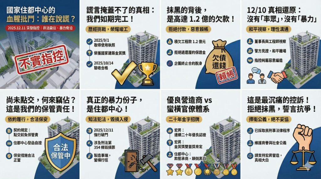 對國家住宅及都市更新中心最沉痛的控訴 宏昇營造 2025.12.12 國家住宅及都市更新中心(下稱「住都中心」)於 2025 年 12 月 11 日突然在國內各大媒體主動挑起一場腥風血雨之新聞批鬥,不實指控 宏昇營造股份有限公司(下稱「宏昇營造」或「本公司」)非法竊佔 「松山延吉段社會住宅統包工程」(下稱「本工程」或「延吉好室」), 並誣稱本公司涉有「加重竊佔」、「以暴力脅迫手段強制驅趕現場保 全及物管人員」、「嚴重危害國家資產與住戶權益」云云。
