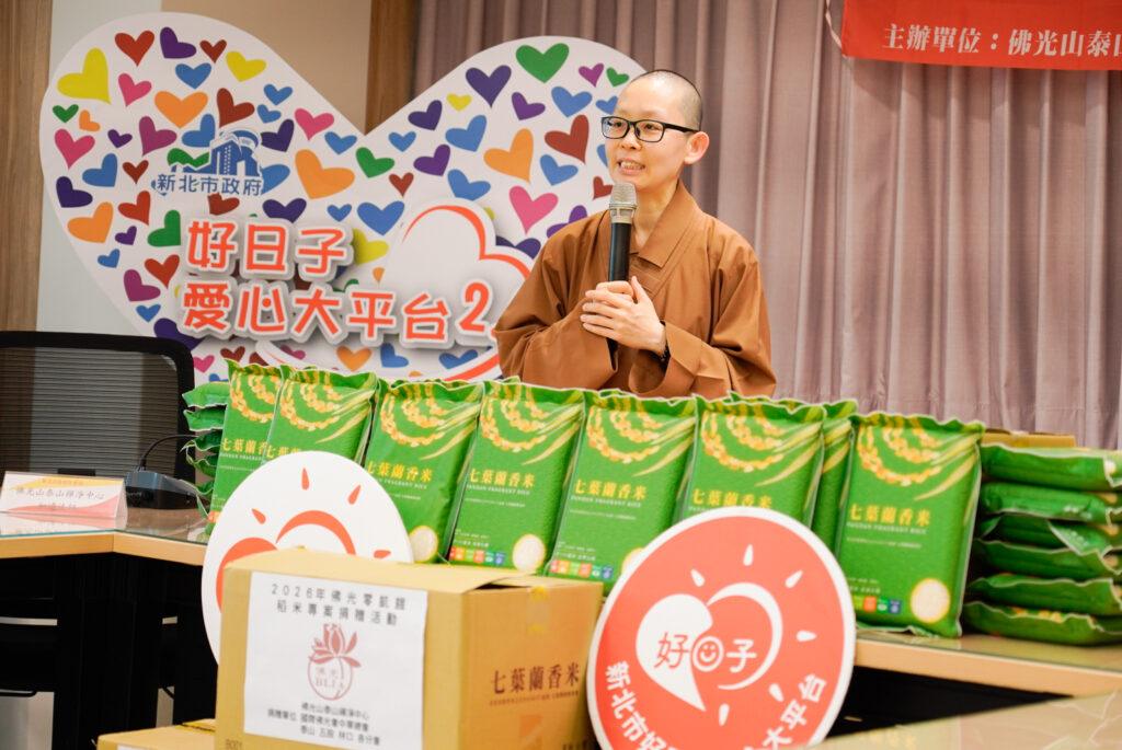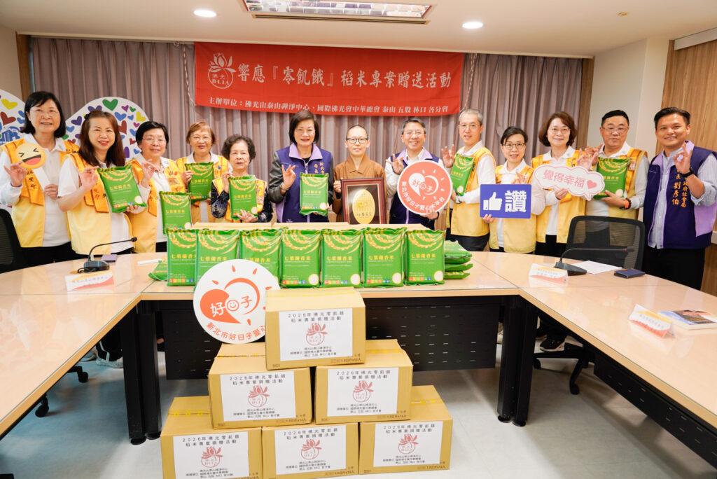 佛光山泰山禪淨中心響應新北市好日子愛心大平台,於1日捐贈1,866公斤白米,由新北市社會局長李美珍代表受贈,並回贈侯友宜市長感謝牌,這批滿載善念與祝福的愛心白米,後續將透過各社福中心發送予弱勢家庭,為家戶餐桌增添一份溫飽與安心。