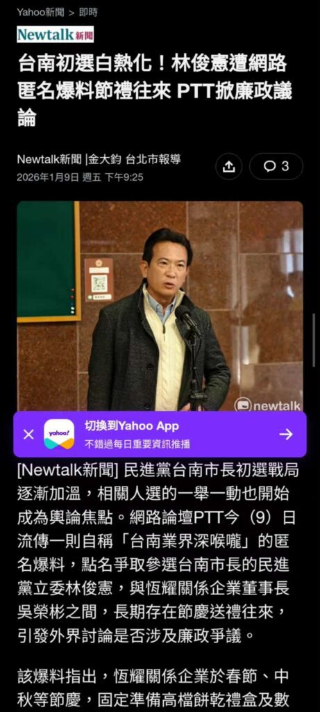 就在初選結果出爐前後,網路論壇PTT突然流出一則自稱「台南業界深喉嚨」的匿名爆料,直指林俊憲與恆耀關係企業董事長吳榮彬之間,長期存在節慶送禮往來,引發是否涉及廉政爭議的討論。爆料內容指出,企業於春節、中秋等節日,固定準備高價禮盒與茶葉,單次金額動輒破萬元,甚至一年多次,並附上疑似企業內部的節禮名冊截圖,試圖強化指控可信度。