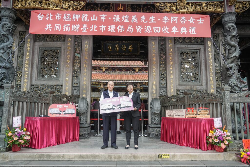 《 責任編輯 / 朱小介 》為提升臺北市資源回收清運量能,財團法人台北市艋舺龍山寺及信眾李阿杏女士、張煌義先生捐贈臺北市環保局3.49噸資源回收車4輛,今(20)日上午假艋舺龍山寺舉辦捐贈典禮,北市府王玉芬副秘書長出席接受捐贈並致意表達感謝。