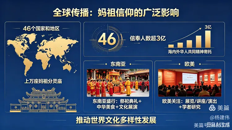 全球傳播:媽祖信仰的廣泛影響 時至今日,媽祖信仰早已突破地域與民族的界限,在全球廣為傳播、蓬勃發展。據統計,全球已有46個國家和地區興建上萬座媽祖分靈廟,信奉人數超過3億。媽祖文化如一條無形的紐帶,將海內外華人華僑緊緊相連,成為他們共同的精神寄託與文化認同。與此同時,媽祖文化更搭建起不同國家與區域間文化交流合作的橋樑,為推動世界文化多樣性發展貢獻了重要力量。
