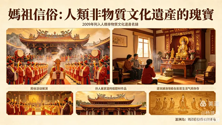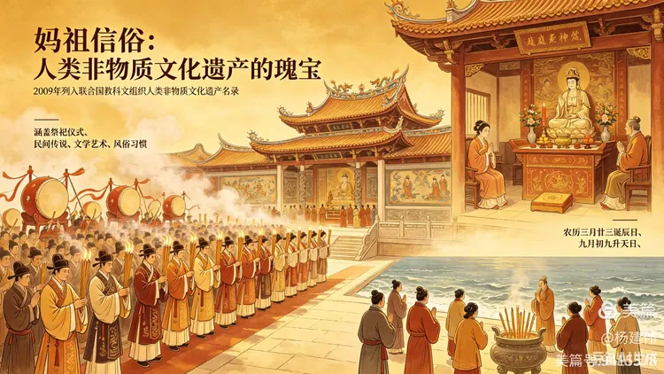 媽祖信俗:人類非物質文化遺產的瑰寶 西元2009年,是媽祖文化發展史上具有里程碑意義的一年。這一年,媽祖信俗被聯合國教科文組織列入人類非物質文化遺產名錄,這份殊榮,標誌著媽祖文化獲得國際社會的廣泛認可與高度讚譽,更意味著媽祖文化正式成為人類共有的精神財富。媽祖信俗涵蓋祭祀儀式、民間傳說、文學藝術、風俗習慣等諸多維度,宛若一座博大深厚的文化寶庫,凝結著中華民族傳統文化的精髓,是中華優秀傳統文化不可或缺的重要組成。