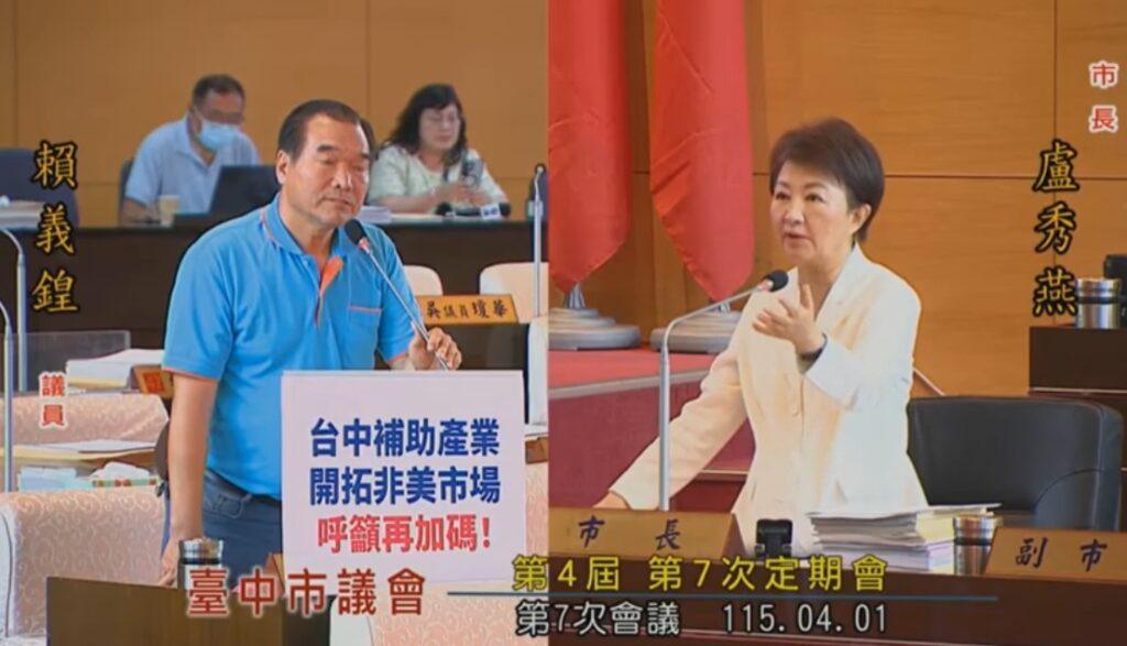 賴義鍠在質詢中也關注產業發展議題,他建議市府未來應加碼補助產業升級與轉型,並協助台中企業開拓非美市場,分散國際貿易風險,以避免台商企業在國際貿易與關稅政策變動下受到衝擊。對此,台中市長盧秀燕表示,市府今年將再度動用第二預備金約2500萬元,用於支持青年創業、產業投資及創新發展,協助市民與青年創業者在投資與創業環境上獲得更多資源與保障,提升城市整體經濟動能。