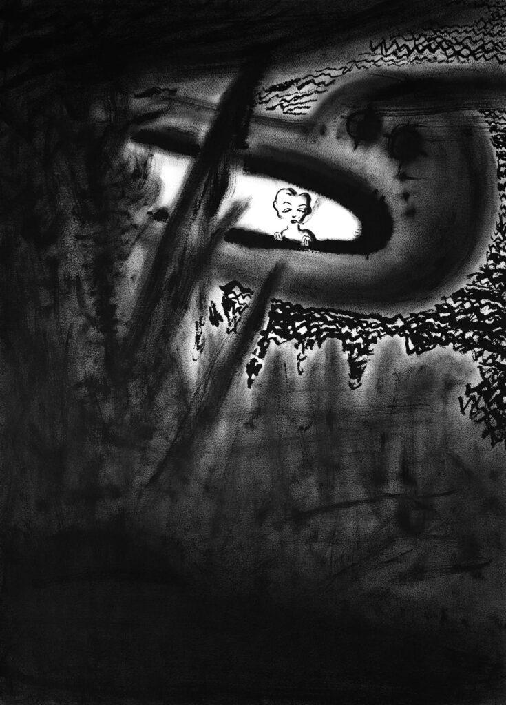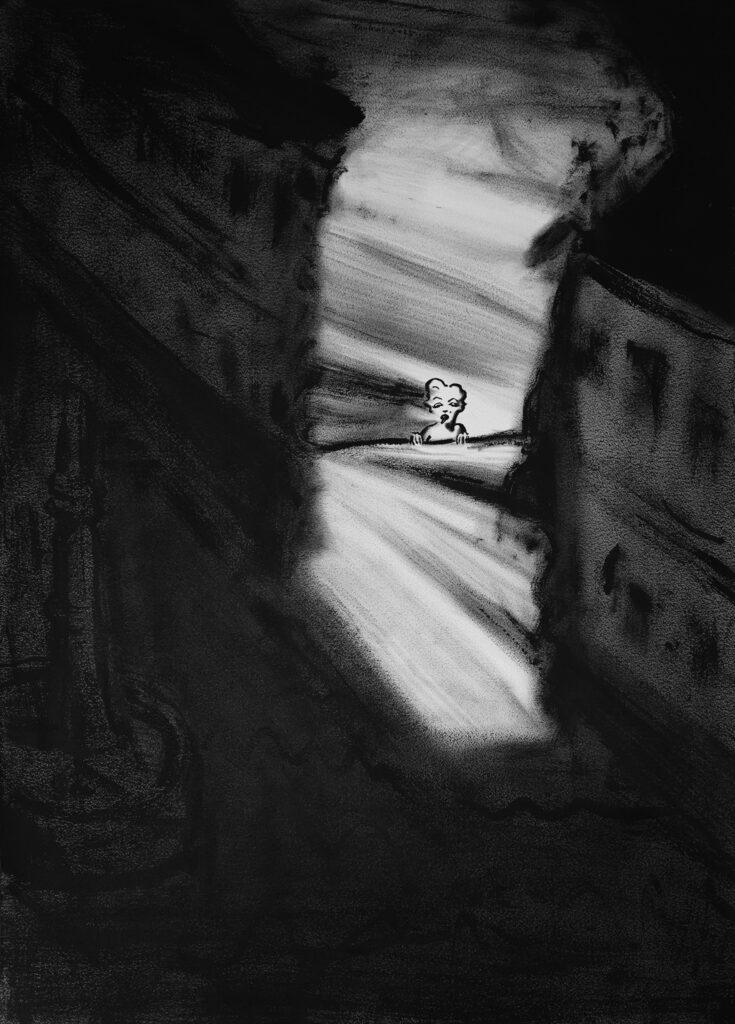 畫面中所指向的是一個想像的虛境,在混沌模糊場域中主人翁「夢露」猶如古畫中獨立孤行的旅人冷眼觀看,似乎周遭就剩她獨自一人,卻一臉淡定地觀看這幻化中的世界,用「孤絕」狀態投射古人遺世獨居或退隱乃至逍遙的心境變化。