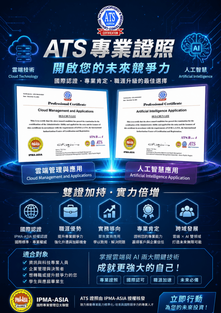 主辦單位強調,在數位轉型浪潮下,「會用AI的人」將成為未來職場最具競爭力的人才。透過ATS系統化應用能力訓練,學員不僅能快速學會AI工具的實際應用,更能在完成課程後同時取得雲端管理與人工智慧應用兩項國際專業證照,為自己的職涯發展開啟新的可能。