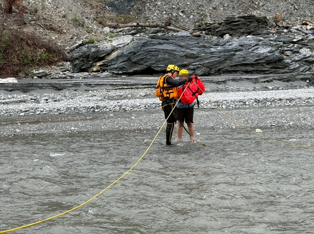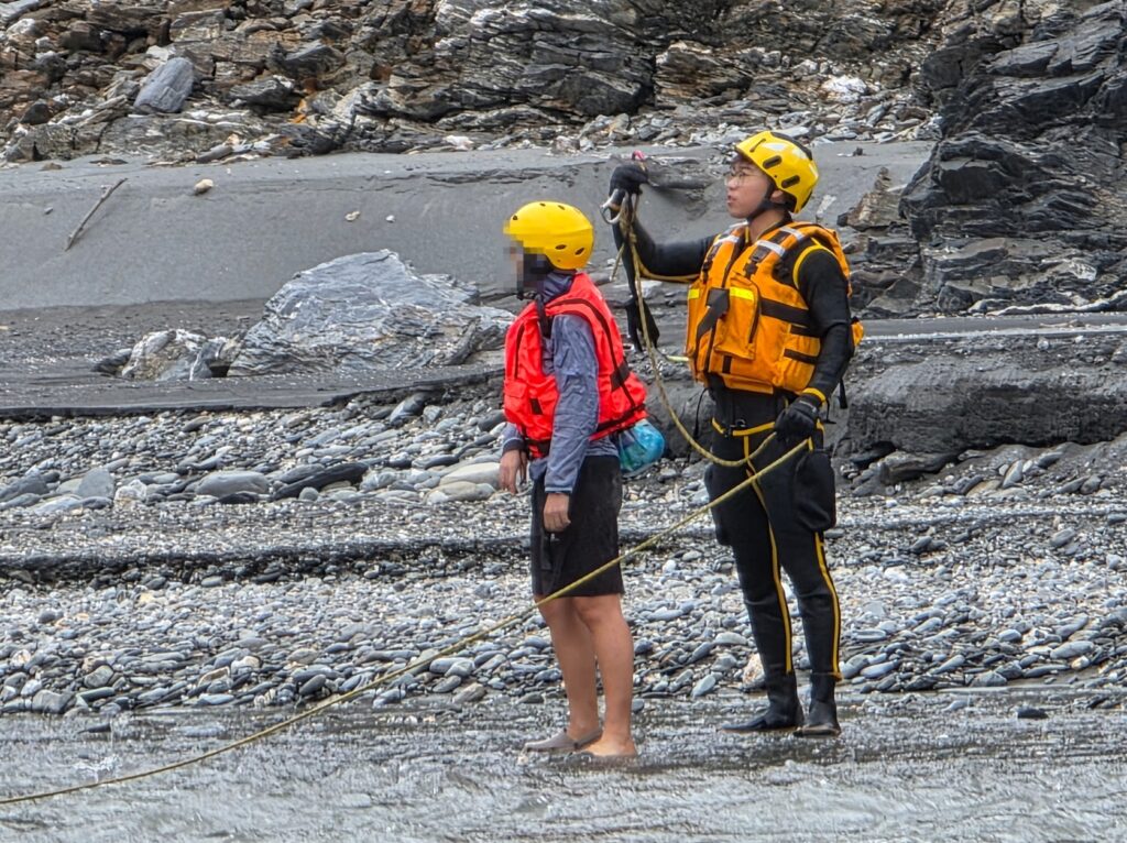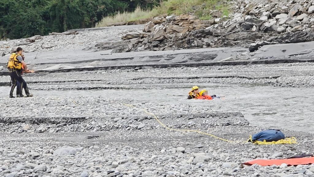 地面搜救人員確認確切位置後迅速挺進。面對現場湍急的溪水,救援團隊展現高度專業,指揮官副大隊長林承逸立即下達水域救援戰術。搜救人員首先採用「攻擊式」入水,奮力橫渡急流迅速接近待救者;在協助民眾穿妥救生裝備後,救援小組巧妙運用水流力道與繩索 牽引的「鐘擺」技術,將受困民眾安全、平穩地擺盪回岸邊。