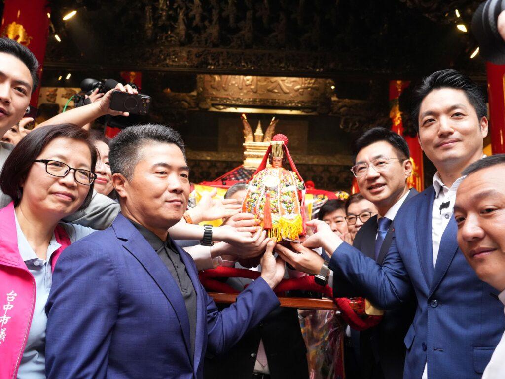 今日上轎大典,立法院副院長江啟臣、立法委員何欣純、廖偉翔、顏寬恒、台中市議會副議長顏莉敏、市議員李文傑、楊啓邦、施志昌、陳政顯、張廖乃綸、楊大鋐、李中、朱暖英、台北市長蔣萬安、台中市副市長黃國榮、賴淑惠、民政局副局長陳寶雲、鎮瀾宮董事長顏清標、副董事長鄭銘坤、嘉義縣新港奉天宮董事長何達煌等人均到場共襄盛舉。(圖片/新聞來源:台中市政府民政局)
