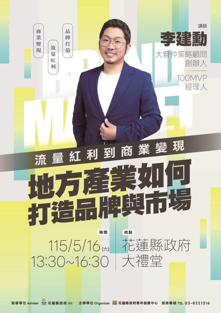 為協助地方產業提升品牌競爭力並拓展市場通路,花蓮縣政府青年發展中心5月16日下午1時30分於花蓮縣政府大禮堂辦理「大師講座–流量紅利到商業變現:地方產業如何打造品牌與市場」,邀請大管仲策略顧問創辦人暨100MVP經理人李建勳,分享品牌經營與商業模式實務經驗,協助地方產業與青年創業者掌握市場趨勢與行銷策略。歡迎踴躍參加,課程免費報名https://ydc.org.tw/zh-hant/activity/course/form/245/