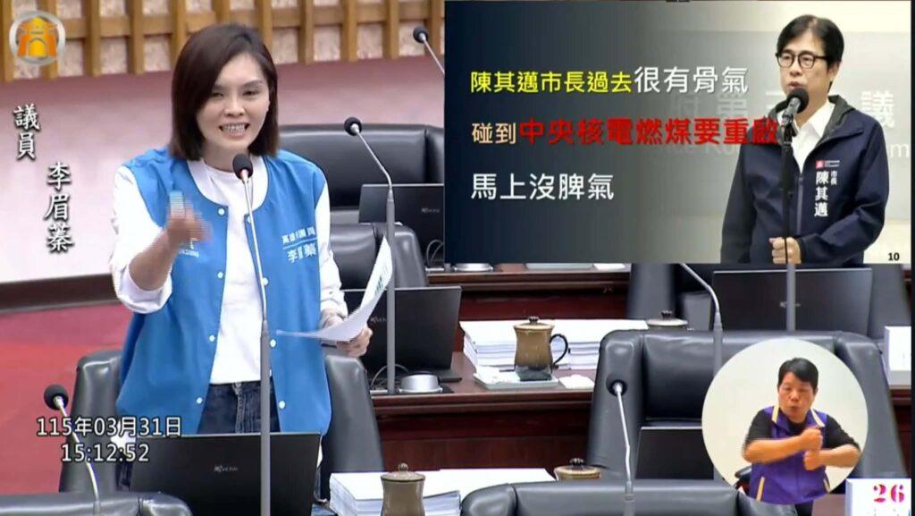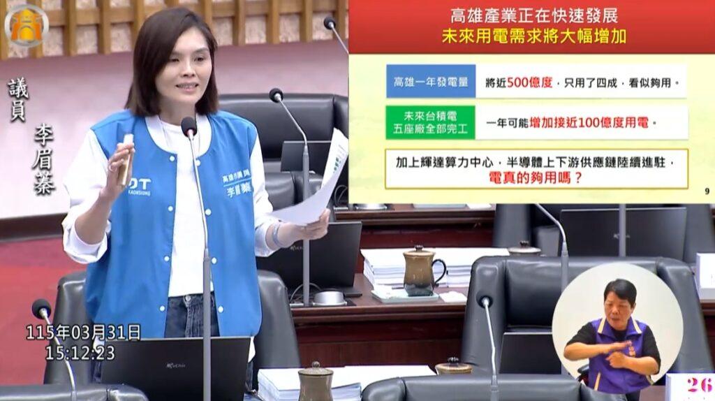 在能源議題方面,李眉蓁則將矛頭指向高雄快速產業擴張所帶來的用電壓力。她指出,隨著半導體產業鏈加速布局,包括台積電高雄設廠及AI運算中心等重大投資案陸續進駐,高雄未來用電需求勢必大幅攀升。她質疑,在年用電量已接近500億度的情況下,現行能源政策是否足以支撐未來產業發展。