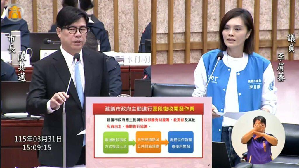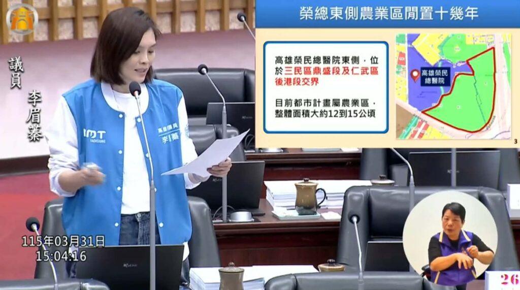 李眉蓁指出,位於左營、楠梓一帶的高雄榮民總醫院,占地約17.5公頃,擁有近1400張病床與超過3500名醫護人員,年門診與住院人次累計突破百萬,是南台灣極具指標性的醫學中心。她認為,面對人口持續成長與高齡化趨勢,現有醫療量能仍有擴充空間,市府應積極規劃周邊土地,打造更完整的醫療園區體系。