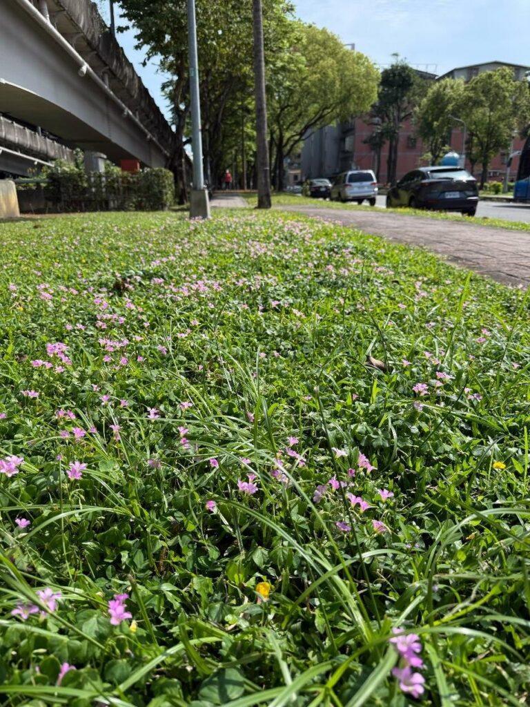 除了流蘇美景,週美綠地、週美公園、安興綠地及行善公園周邊等綠地公園相距不遠,卻各自擁有獨特氛圍。「週美綠地」與「週美公園」隱身住宅區,環境清幽,民眾漫步於平整步道上,便能體驗微風拂過時花瓣如雪片飄落的奇景,至於週美綠地,首先映入眼簾的是草皮上一片紫色的細碎花海:紫花酢醬草與通泉草在草叢間密集開放,花朵雖小但數量龐大,微風拂過時像紫色波浪輕輕起伏。「安興綠地」則擁有開闊的綠色草坪,非常適合親子與毛小孩一同前來,在樟樹下鋪開野餐墊,近距離感受春日美好。