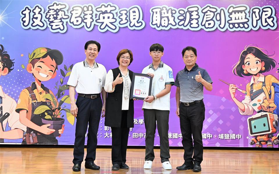 彰化縣114學年度國中技藝教育課程競賽頒獎典禮暨成果發表活動,4月20日在田中鎮龍江館盛大登場。彰化縣長王惠美親自表揚161位得獎學生及91位指導老師,並感謝12所技術型高中師長對技藝教育的投入與貢獻。