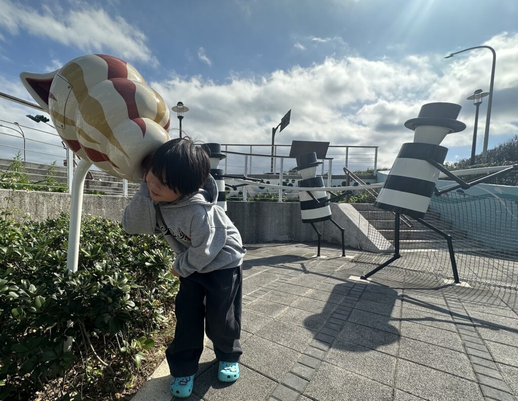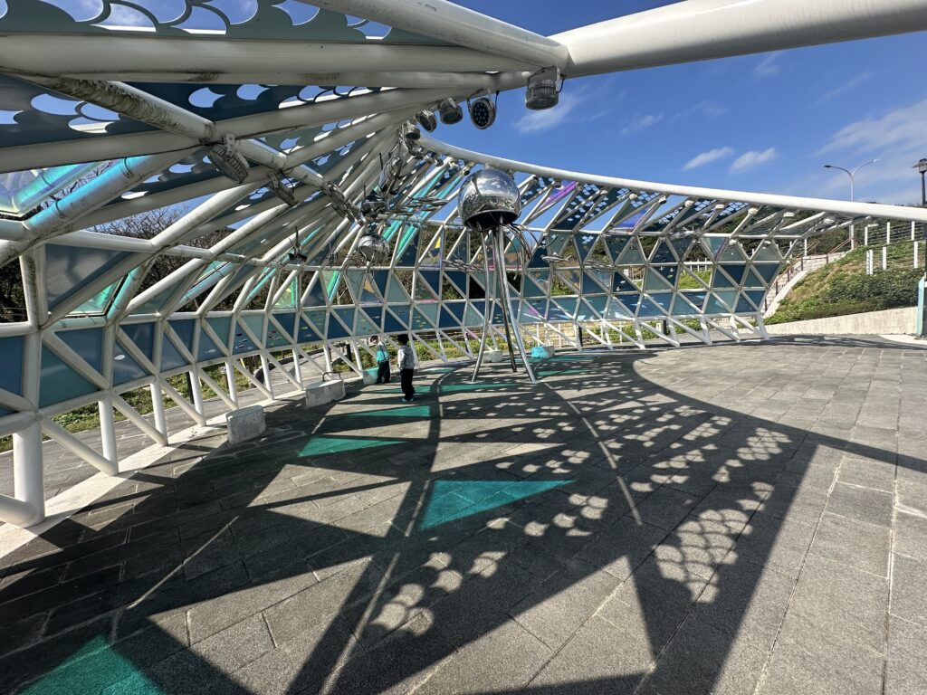 園內設置「牽罟織夢網」裝置藝術,透過不鏽鋼構件與彩色玻璃的組合,呈現隨光線變化的視覺效果;另規劃互動式裝置與造型座椅,提供不同年齡層使用者停留、探索與交流的空間。公園同時具備滯洪功能,在兼顧景觀與使用性的同時,也強化環境安全。情人節當天,民眾可在雙心地標前留下合影,沿著步道慢慢散步,讓節日回歸陪伴本身。石門雙心公園以輕鬆、不設限的方式,提供一處讓各種關係都能安心停留的海岸空間。