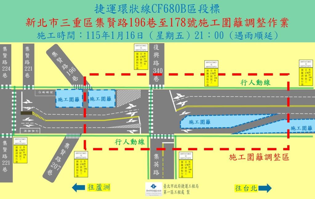 預定於115年1月16日夜間進行三重區集賢路196巷至178號施工圍籬調整作業,施工單位將自115年1月16日(五)夜間21時起,進行中央避車線(三重區集賢路196巷至178號)施工圍籬調整作業,遇雨順延或擇日再施工,施工範圍如附圖。施工作業期間請用路人行經施工區域減速慢行,並依改道後之宣導牌面、遵循導引標誌及現場指揮人員導引指示減速慢行,以確保行車安全。