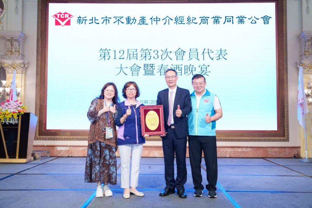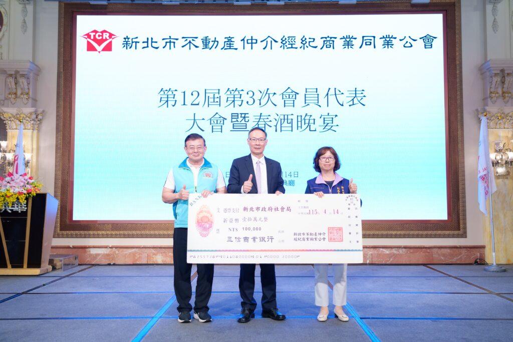 新北市不動產仲介經紀商業同業公會長年關心社會公益,日前在新莊典華餐廳召開第12屆第3次會員代表大會時,響應新北市好日子愛心大平台,由理事長林平川代表捐贈10萬元,做為新北市家外安置兒少支持服務計畫,社會局副局長許秀能到場代表受贈,並回贈侯友宜市長的感謝牌,地政局長汪禮國和經發局長盛筱蓉亦到場致意。