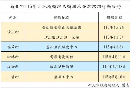 新北市地政局地籍科科長王珮榕表示,新北市幅員遼闊,地政局及所屬地政事務所團隊因應各區域屬性,以地政專車及行動服務隊串聯社區,足跡遍及城鄉、深入鄰里,提供民眾諮詢、代收及代寄案件及辦理簡易地政業務。因應清明時節慎終追遠,地政局為加強宣導繼承登記,近期各地政事務所的行動服務隊及地政專車,主動前往各處墓園及市民活動中心等辦理諮詢服務,讓民眾了解繼承登記該如何辦理,暖心服務便利直送,並落實行動治理的市政理念。