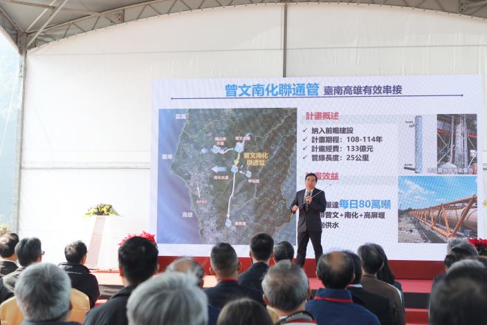 水利局說明,曾文南化聯通管工程為行政院於107年核定之重大水利建設,納入前瞻基礎建設計畫推動,計畫期程自108年至114年,總經費約133億元,工程建置曾文水庫至南化淨水場間約25公里輸水管線,並設計雙向供水系統,最大每日輸水量可達80萬噸,可有效串聯曾文水庫、烏山頭水庫、南化水庫及高屏堰水系,建立南部區域水源互補與備援機制。另該工程充分利用水庫間高程差,採重力輸水方式進行雙向調度,不需額外動力即可完成輸水作業,兼顧節能與效率,並具備加值發電潛力,其相關設施亦可結合小水力發電系統,提升水資源使用附加價值,展現永續水利建設成果。