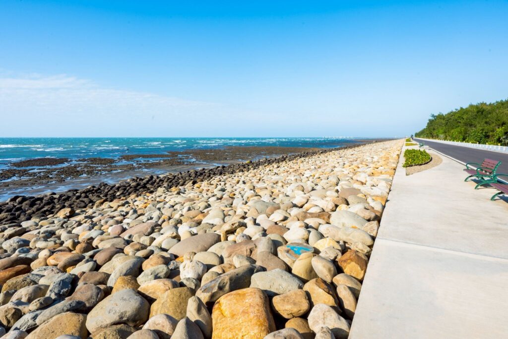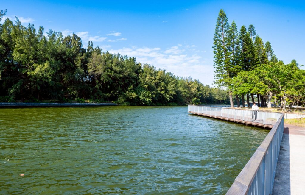 海岸及資源循環工程處表示,後湖溪全長約1.3公里,市府已完成約900公尺河道清淤,並改善既有河堤與水域安全,設置景觀平台、湖畔咖啡屋、淋浴間、親子廁所及約600公尺堤頂自行車道,串聯海螺文化館與永安漁港,提供全時段的親水休閒空間。園區北側新屋事業性海堤則採生態工法興建約940公尺拋石護岸,透過多孔隙結構吸收浪能,兼顧海岸防災、生態棲地與觀海視野,為永安漁港周邊打造更安全且具永續價值的濱海環境。