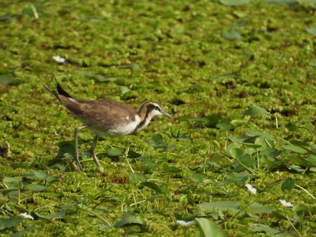 此外,外型優雅的水雉,是園區內另一觀察焦點。水雉擁有修長腳趾,能在浮葉間行走而不下沉,目前已換上樸實的冬羽,與繁殖期的華麗羽色形成對比。由於水雉對棲地條件高度敏感,其穩定出現顯示濕地水位管理、植被維護與人為干擾控制皆運作良好, 象徵洲仔濕地在生態維護上成果穩定。