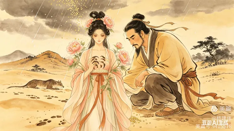 適逢人間災荒,赤地千里,萬民嗷嗷待哺。天帝感倉頡造字之功德,命天兵開倉降下穀米雨。穀粒如金,自天而降,鋪滿山川平野。百姓奔走相告,以木瓢舀谷,以陶罐盛米,哭聲漸轉為笑聲。黃帝為彰其功,將下穀雨之日定為“穀雨節”,並令後世於倉頡故里白水縣立廟祭祀。廟中香綿延千年,每逢穀雨,鄉民皆攜新麥供奉,祈求文字通神、智慧永續。