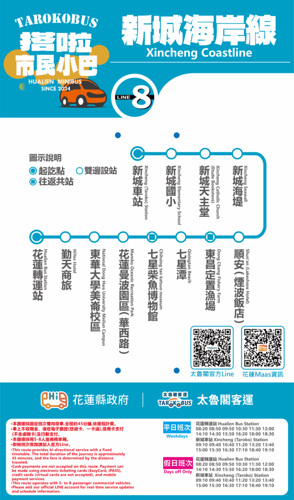 「新城海岸線」由太魯閣客運投入全新市民小巴車隊營運,路線行經花蓮轉運站、曼波海洋生態園區、七星潭、東昌定置漁場、新城海堤、新城天主堂(神社遺址)至新城車站,每日固定24班次,每班客座7人。全線採無現金乘車,提供悠遊卡、一卡通及交通QR Code等多元支付方式。自2月6日至2月8日通車首三日全線免費搭乘,民眾可透過太魯閣客運官方LINE查詢即時班次資訊,或洽詢客服電話03-8630080了解更多活動內容;縣府誠摯邀請民眾搭乘體驗,感受花蓮第一條穿梭193縣道山海間的「新城海岸線」,體驗獨特公運美學與山海日常。(圖片/新聞來源:花蓮縣政府建設處)