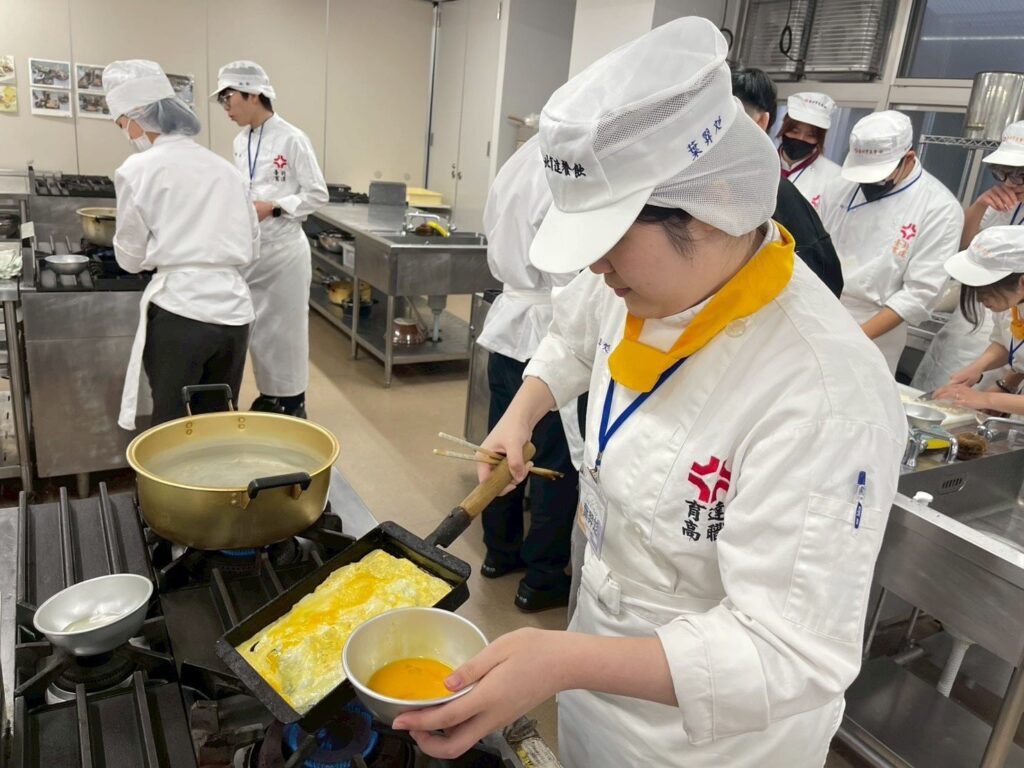 見學團重點行程之一為前往日本知名餐飲學校大和青藍高校進行廚藝研修課程。該校為日本規模最大的餐飲與烘焙專業學校之一,培育出眾多活躍於飯店、知名餐廳與米其林餐廳的優秀人才。研修課程中,由日本師傅親自指導學生製作日式便當,同學們在專業講解與示範下,認真完成各項料理步驟,並品嘗自己親手完成的餐點,從實作中體會日本料理對細節與品質的講究。