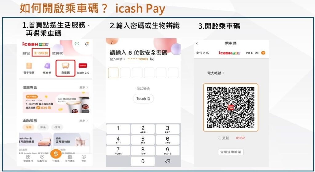 本次市區公車交通乘車碼服務,將開放「悠遊付、iPASS MONEY、icash Pay、街口支付及全支付」共5家電子支付,提供民眾更多元彈性的支付選擇,只要1支手機即可通達雙北地區各大公共運輸節點。公運處提醒使用交通乘車碼搭車時,驗票機顯示掃碼成功即代表扣款完成,旅客無須等待手機端APP畫面顯示,以免影響後續旅客上下車動線。
