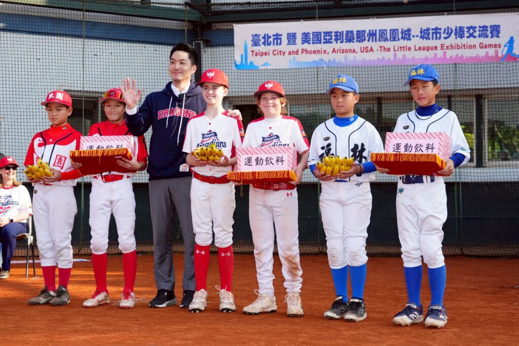 今13日午後,臺北市長蔣萬安前往新生公園棒球場與美國亞歷桑納州鳳凰城市長Kate Gallego共同擔任開球貴賓,為2026年美國亞利桑那州與本市少棒隊交流賽揭開序幕。