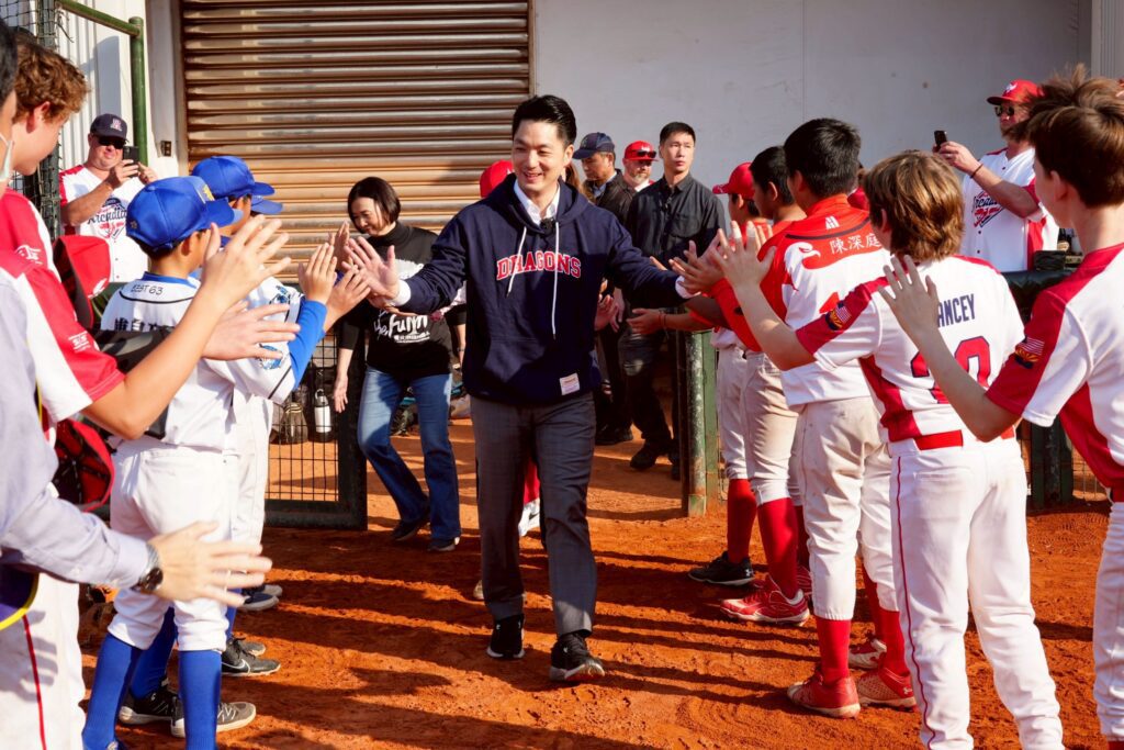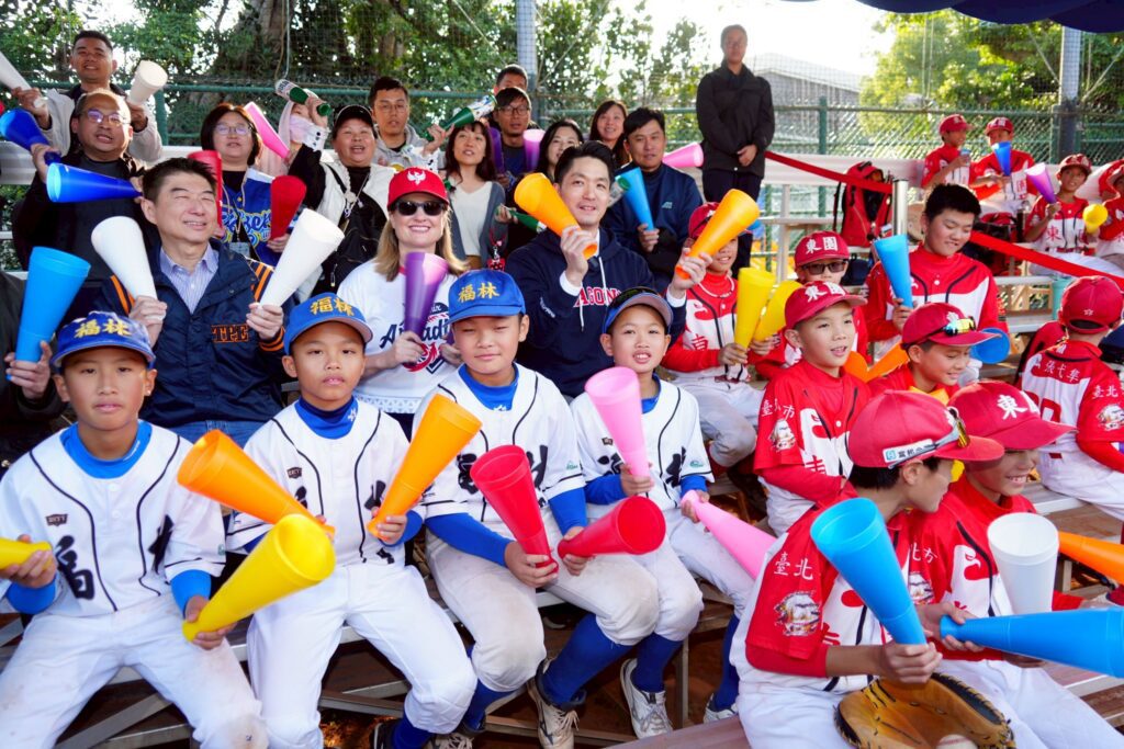 他進一步說,東園國小棒球隊在去年一路打到威廉波特,讓我們引以為傲;而福林國小則是多年來的棒球強隊。今天的交流不只是球場上的分數,棒球就是我們共同的語言,你們說英語、我們說中文,但我們都會說HOME RUN。