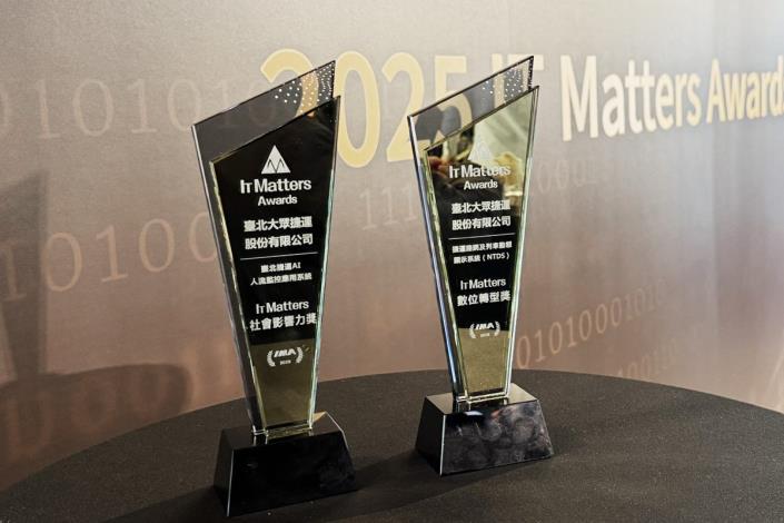 臺北捷運公司自創「捷運路網及列車動態顯示系統」、「AI人流監控應用系統」,於12月9日IMA中華民國資訊經理人協會IT Matters Awards頒獎典禮上大放異彩,榮獲「數位轉型」、「社會影響力」,分別由行政院院長卓榮泰及數位發展部部長林宜敬頒獎,本公司由總經理黃清信代表領獎,肯定臺北捷運公司在數位創新及運用面向上的卓越表現。