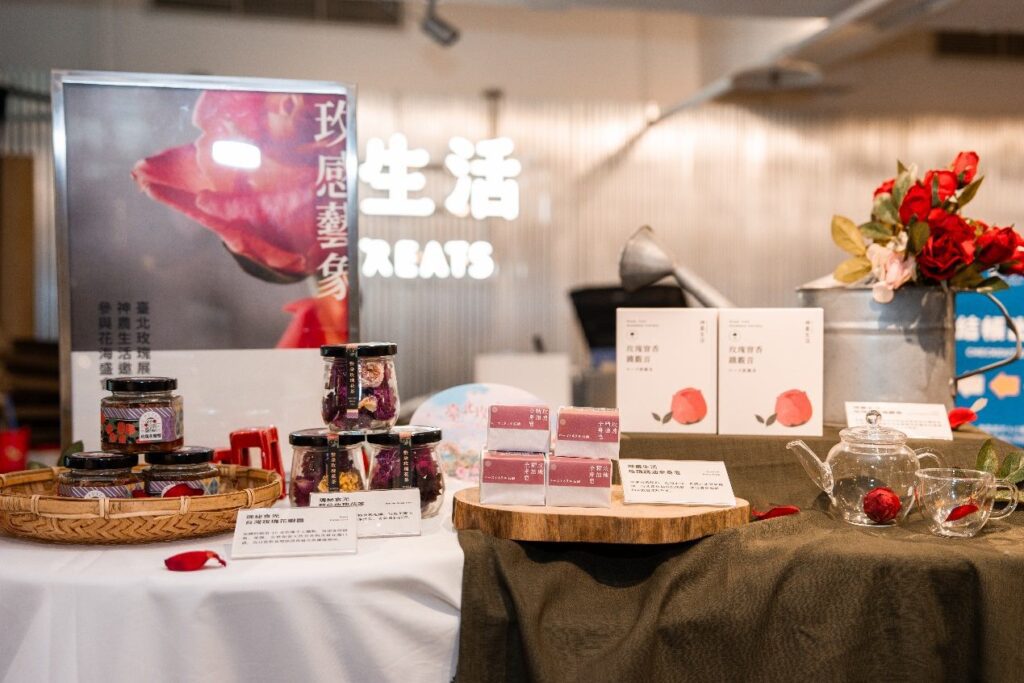 這次臺北玫瑰展嘗試將玫瑰元素融入大眾的日常生活裡,在商圈店家內可以看到玫瑰的多種樣態。譬如中山商圈的歐華酒店,本次配合玫瑰展推出消費套餐送玫瑰拿鐵或玫瑰烏龍茶,Lotty cafe綠蒂咖啡則有消費玫瑰花茶享8折的優惠,在店裡還能驚喜地發現玫瑰咖啡鋼模等,來到花博MAJI市集的神農生活,則能購買各式玫瑰相關產品!臺北市中山北路婚紗商圈發展協會則在最佳風情國際婚紗店進行店頭改造,將婚紗店最具特色的大片玻璃櫥窗布置唯美的玫瑰窗貼,打造出玫瑰與婚紗交織的美麗景致。
