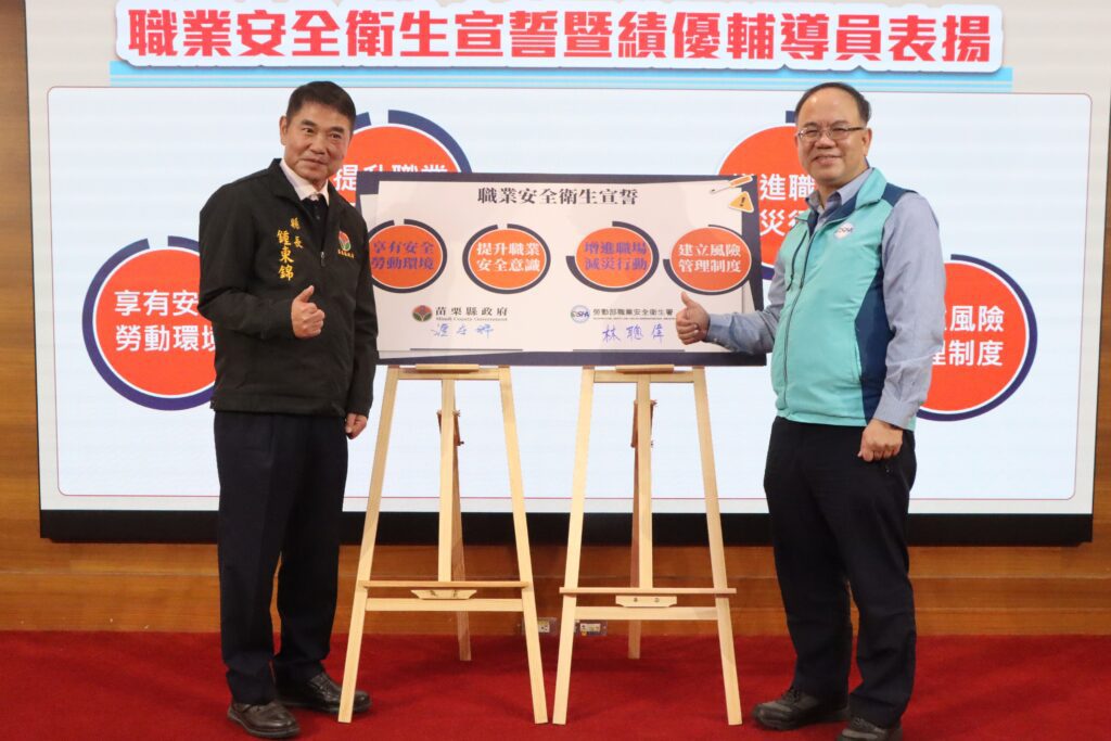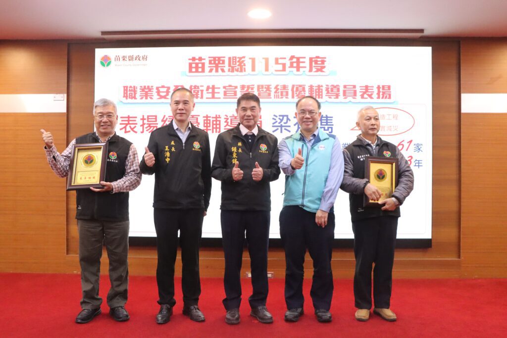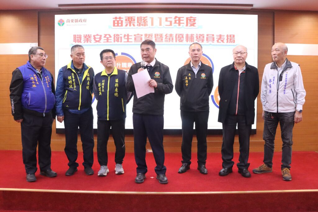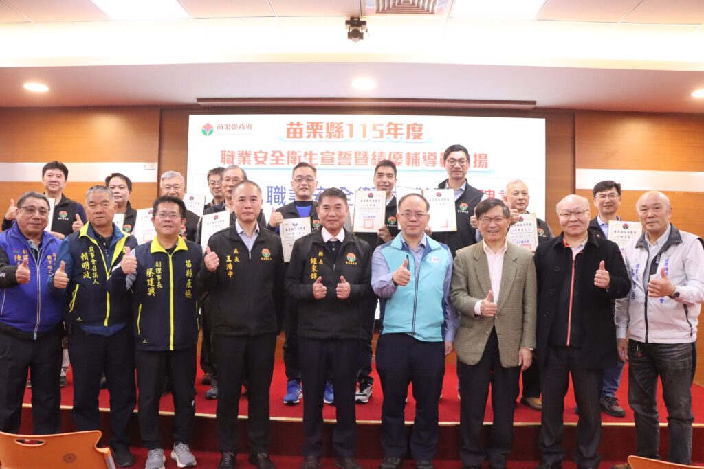 苗栗縣政府27日上午在本府A201會議室舉辦「115年度職業安全衛生宣誓暨公部門職業安全衛生業務人員考取證照表揚活動」。活動由縣長鍾東錦頒發職業安全衛生輔導員聘書、致贈績優輔導員獎牌,並對公部門同仁考取職業安全衛生證照者頒發獎狀,以表彰其專業努力與貢獻。勞動部職業安全衛生署中區職業安全衛生中心林聰偉主任及本縣各級工會理事長等亦蒞臨見證。