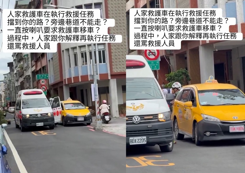 【本報訊】 超離譜!高雄市近日發生一起引發眾怒的交通亂象,一輛計程車在行駛途中,遇到消防局救護車正在處理車禍救援,竟不顧現場傷患安危,連續鳴按喇叭要求救護車挪位讓路。救護人員在進行急救時,還被迫暫停作業,向該名計程車司機說明狀況,未料對方不但不理會,還出言辱罵,整段過程被路旁民眾拍下並上傳網路,引發社會譁然。