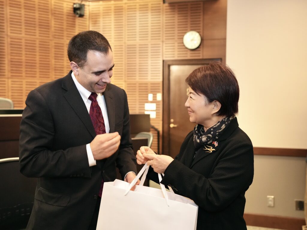 盧市長午後接續拜會姊妹市塔可瑪市長易卜生(Anders Ibsen),雙方交流中意外發現擁有相似的專業背景。盧市長分享自己畢業於政大地政系,並在擔任立委期間,積極推動台灣「不動產估價師」法案與專業證照制度;而易卜生市長也正巧具備不動產估價師證照,相互交流熱絡。