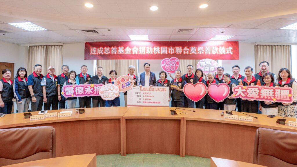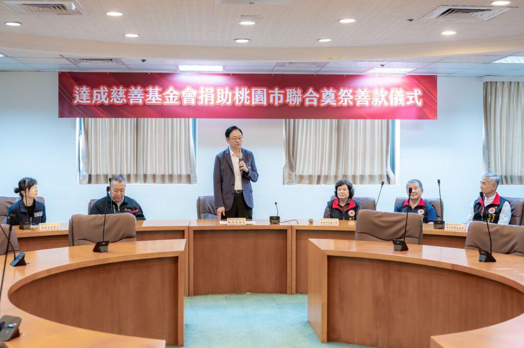 桃園市長張善政今(15)日上午於市府,出席「財團法人達成慈善基金會捐助聯合奠祭善款」儀式。張市長表示,達成慈善基金會自101年起,已連續15年捐助善款作為聯合奠祭之用,累積捐款金額已逾2,828萬元。張市長肯定基金會長期熱心公益,幫助經濟較為困難的家庭,充分展現社會的溫暖與關懷。