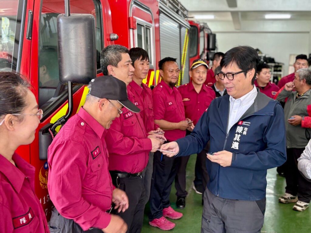 去年0728豪雨造成嚴重災害,轄區警、消同仁不畏風雨,全力投入撤離及救援行動,陳其邁感謝全體消防同仁在各類災害中不眠不休地拯救生命,守護市民安全,也撥空與消防弟兄閒話家常、小聊登山趣事,氣氛輕鬆愉快。