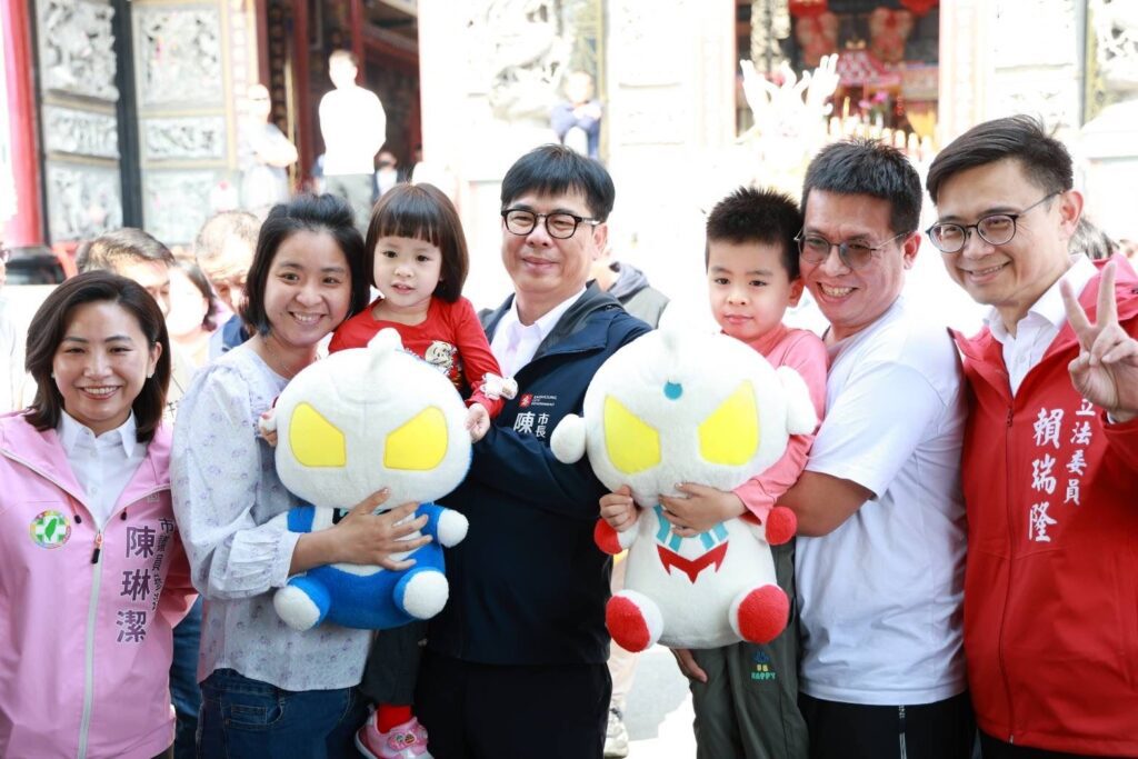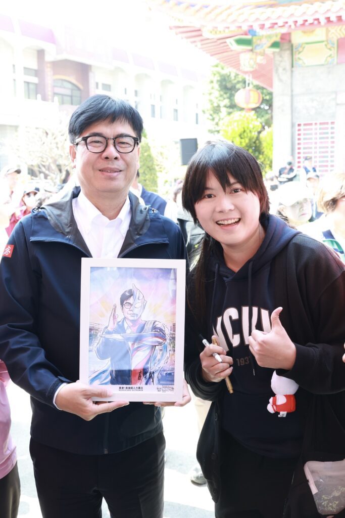 市長隨後轉往茄萣區萬福宮、湖內區慈濟宮及路竹區天后宮等地方信仰中心參香,現場民眾大排長龍。市長除親自發送超人力霸王開運小紅包,祝福市民朋友在新的一年「馬上有錢」、「馬上幸福」,也親切與盛裝出席、精心裝扮成超人力霸王或手持畫作的民眾互動合影、簽名留念,現場洋溢新年喜悅與熱鬧氣氛。(圖片/新聞來源:高雄市政府新聞局)