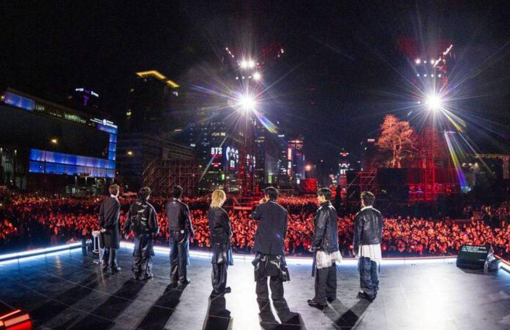 他們走向首爾市政府在廣場中央特設的舞台——以光化門城樓為背景,群山環抱其間。成員Suga向全場表示:「能在韓國歷史最悠久的光化門演出,我們深感榮幸。我們將新專輯命名為《阿里郎》,正是為了彰顯我們的身份認同。」