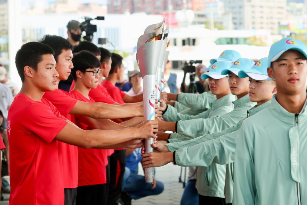 為即將登場的全中運揭開熱血序幕,聖火今日於高雄流行音樂中心交接,並在嘉義縣長、高雄市長的共同鳴笛下,象徵聖火隊出發啟程,儀式隆重意義深厚,展現城市攜手支持體育發展的合作精神;此外,翁章梁與陳其邁也相互致贈在地精選農特產品阿里山精品咖啡與高雄旗山香蕉蛋捲,象徵友好交情,高雄並以地主情誼支持嘉義縣,讓聖火點燃選手的夢想之路,為選手喝采。(圖片/新聞來源:高雄市政府新聞局)