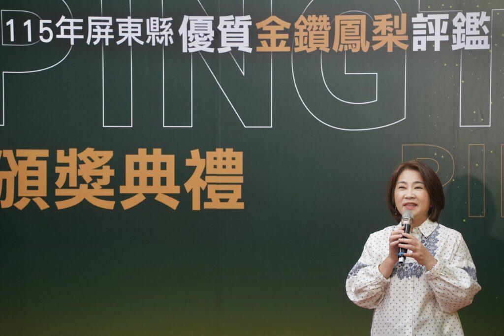 4月正值屏東金鑽鳳梨產季,為選出屏東當季、品質口感最佳的鳳梨,屏東縣政府舉辦「115年屏東縣優質金鑽鳳梨評鑑」,共有42組農民參賽,經產、官、學三方專家共同評鑑後,今(9)日由縣長周春米頒贈獎項予獲獎農民,由潮州鎮農會林舜英獲得冠軍,其鳳梨糖度高達18.6度,同時獲選「甜度王」,展現屏東金鑽鳳梨的優異品質與風味。