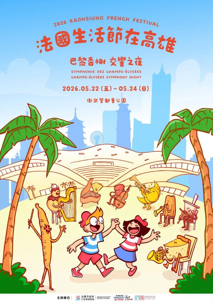 「法國生活節在高雄」自2024年首辦即獲熱烈回響,2025年更吸引三日16萬人次參與,兩年累計逾27萬人次,展現市民對國際文化活動的高度支持。2026年活動主視覺首度公開,邀請法國插畫家Christopher Boyd操刀,以活潑創作風格,融合高雄城市意象與法式藝術風格。首度推出「日光」與「夜色」雙主視覺設計,呈現不同時段的高雄地景風貌。日光版本以明亮色調勾勒悠閒輕盈的生活節奏,夜色版本透過光影與舞台氛圍,營造浪漫且富有韻律的城市夜景,呼應今年主題「巴黎香榭.交響之夜」,串聯從日到夜的多重文化體驗。