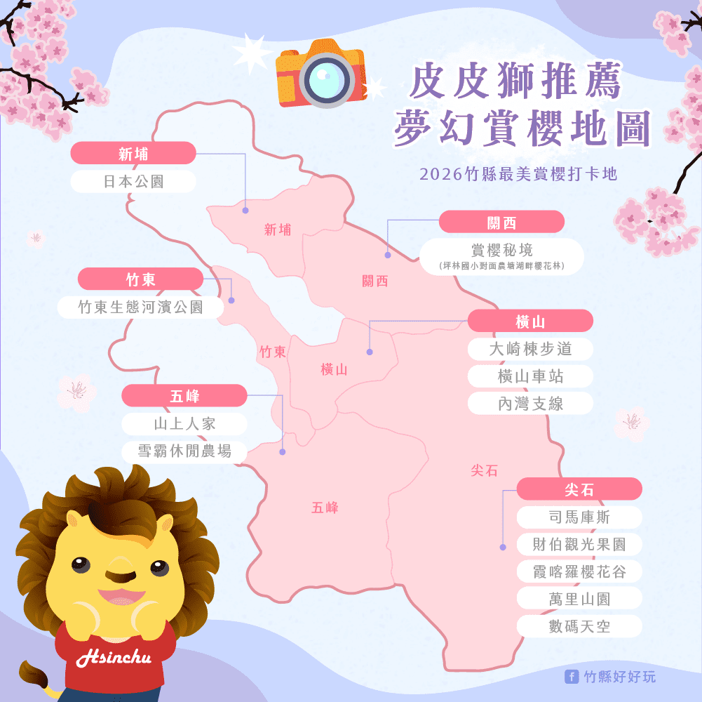 春意漸濃,2026年新竹縣櫻花季即將拉開序幕!隨著位於關西鎮坪林國小旁的湖畔賞櫻秘境櫻花悄悄綻放,全縣的粉色花海將席捲各大社群媒體。新竹縣吉祥物「皮皮獅」已經等不及搶先秀出夢幻賞櫻景點清單,從平地賞櫻秘境到「上帝的部落」司馬庫斯,歡迎全國民眾來竹縣走春,感受春天限定的粉色浪漫。