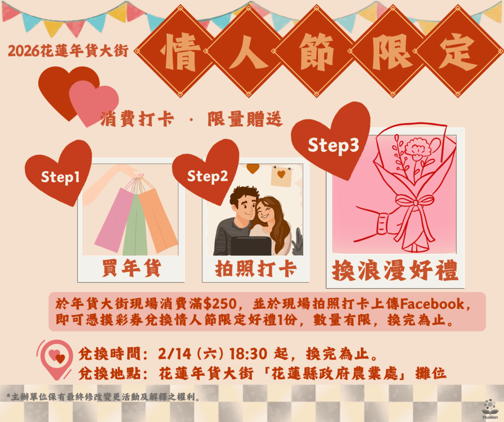 農業處長陳淑雯表示,為回饋鄉親支持,農業處特別規劃情人節限時回饋活動,希望讓大家在採買年貨的同時,也能為春天留下專屬記憶。民眾只要於2月14日(六)當天在年貨大街消費滿250元,與現場裝置藝術合影,上傳至個人社群平台打卡並標記「#2026花蓮年貨大街」、「#情人節驚喜」、「#花蓮走春」及「#幸福遊樂園」,即可於晚間18時30分起至「花蓮縣政府農業處」攤位兌換限量情人節限定驚喜,數量有限,換完為止。